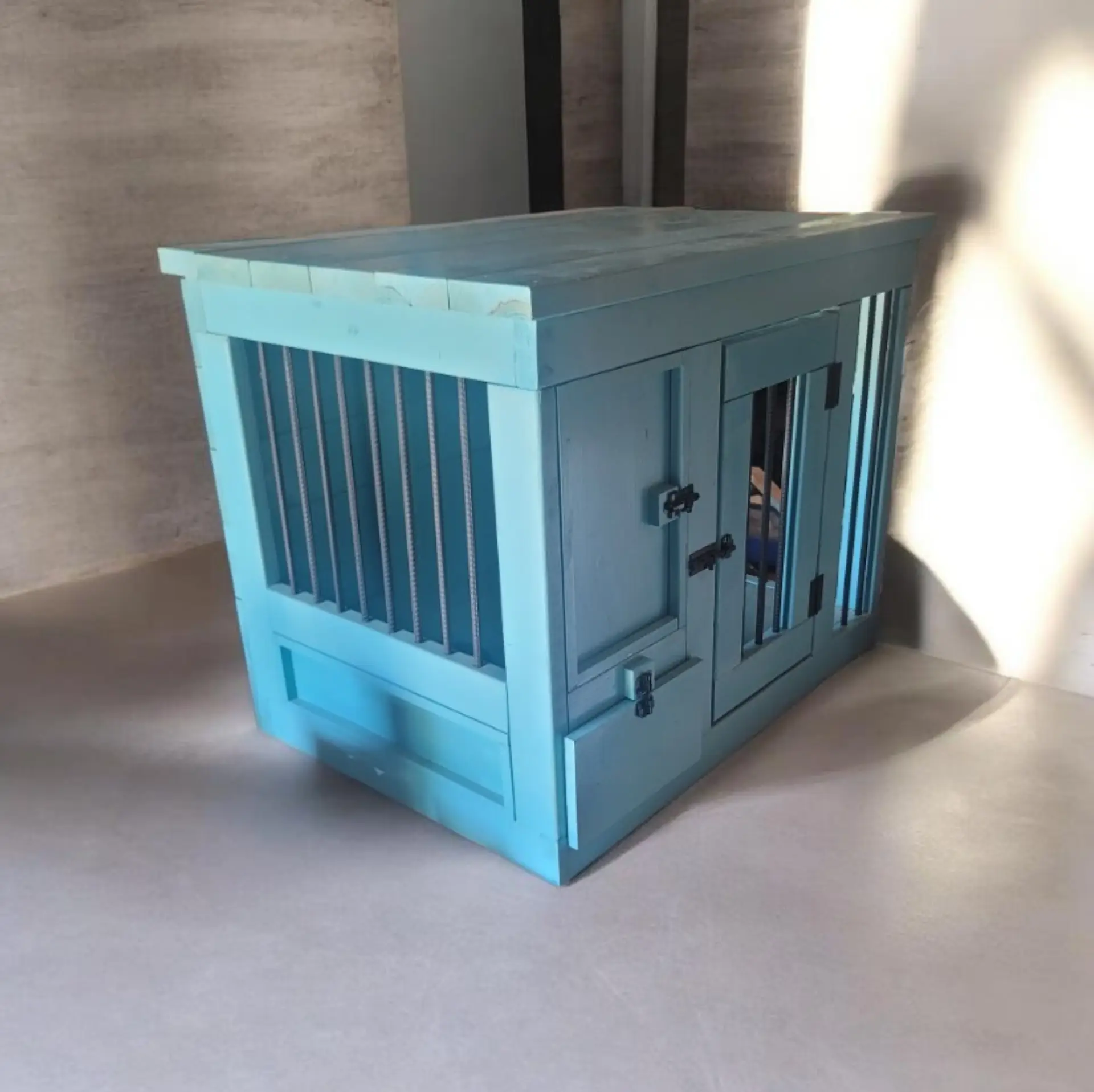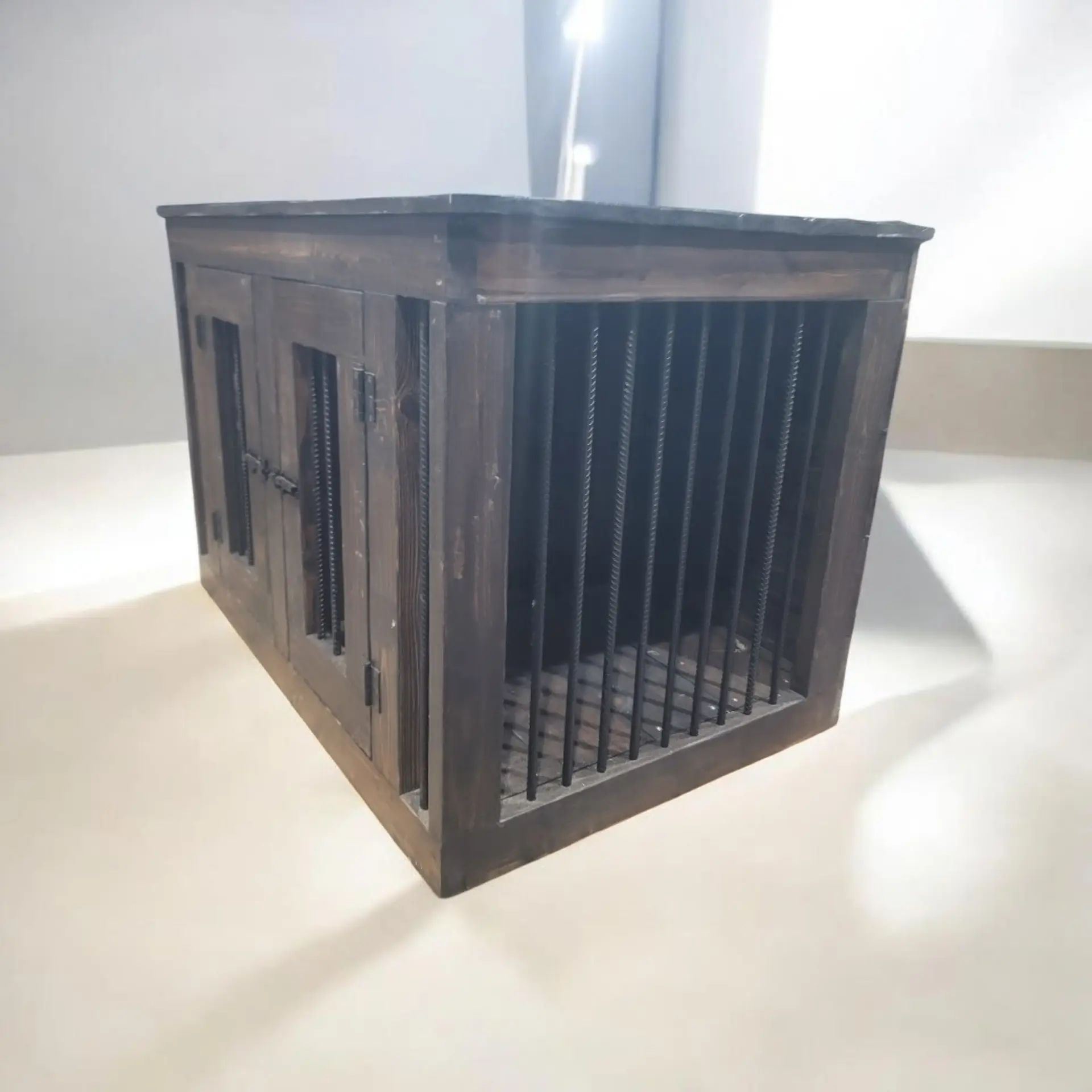 The Double Dog Kennel is a large, custom-built indoor crate made for maximum comfort and security. Crafted from solid wood and reinforced with rebar, it provides a strong and durable structure while maintaining an elegant furniture-style look.